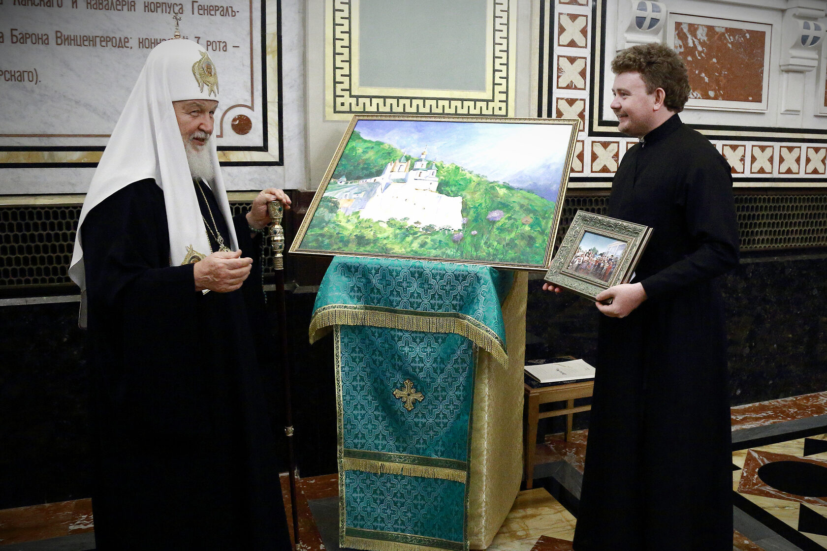 Святейшего Патриарха Московского и всея Руси Кирилла. На картине дети изобразили Николаевский храм Успенской Святогорской лавры как символ мира и спокойствия их многострадальной Родины.